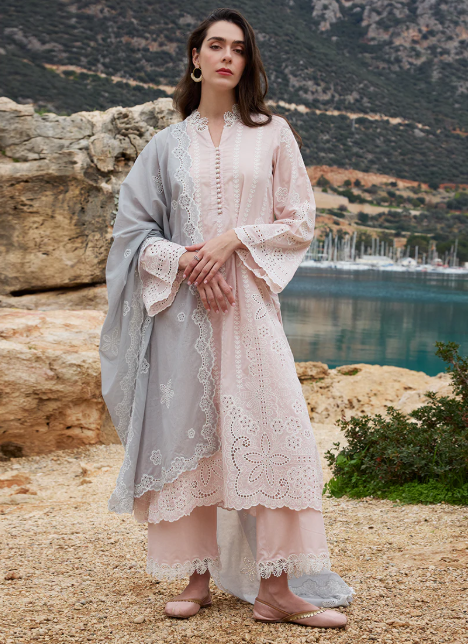Safa in Pink/Steel Blue. A cutwork embroidered cotton lawn 3-piece outfit paired with dyed voile embroidered dupatta.